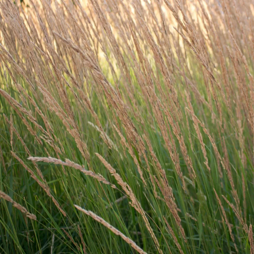 This ornamental grass is known for its upright growth habit, reaching heights of up to five feet. Its linear leaves form a dense, clump-like structure, offering a sleek, vertical element to gardens. In early summer, it blooms with golden-brown flower spikes that add texture and movement.