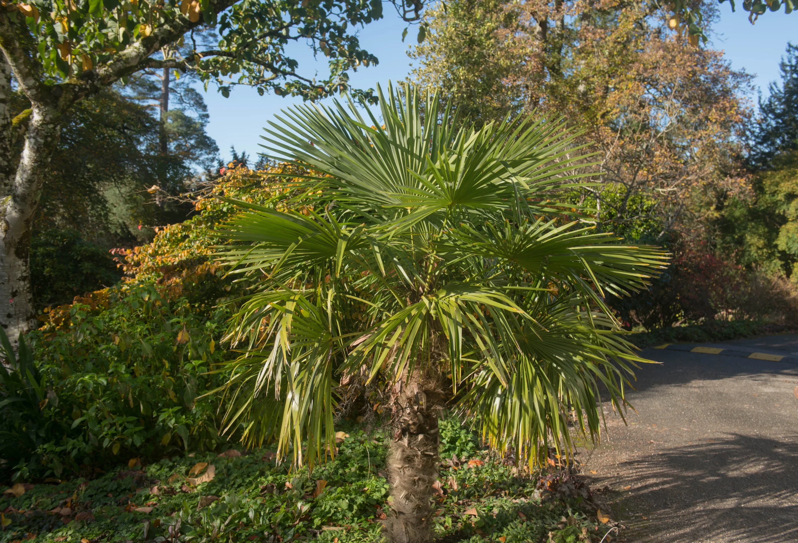 As fall arrives, the Windmill Palm continues to maintain its vibrant green appearance, adding a touch of enduring warmth to the cooling landscape.